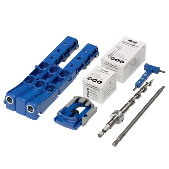 - Ensemble complet de gabarit pour vis enchâssées incluant deux guides de perçage avec cale d’espacement, une mèche de perçage avec collet d’arrêt, une clé hexagonale avec dispositif de mesure des matériaux intégré, un adaptateur universel pour serre, 40 vis avec une pointe à tête carrée de 6’’ de longueur