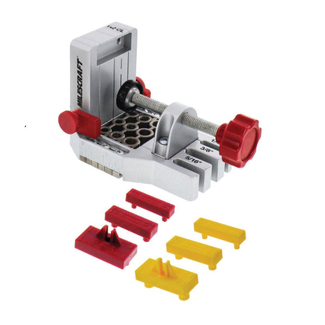 - Le JointMaster™ est livré avec trois blocs de forage et est capable de créer des joints en utilisant les tailles de goupilles les plus courantes - 1/4″, 5/16″ et 3/8″. Chaque bloc de perçage en acier trempé est réglable pour accepter et aligner les trous de cheville centrés sur les planches de 1/2" à 3". Les échelles intégrées aident à aligner et à centrer vos chevilles. Les repères de centrage pratiques garantissent que vos trous sont là où vous le souhaitez. Si vous utilisez des planches standard de 1/2", 5/8", 3/4 ou 1-1/2", trois blocs d'espacement inclus aligneront automatiquement les blocs de perçage et vous aideront à sélectionner la taille de cheville appropriée.