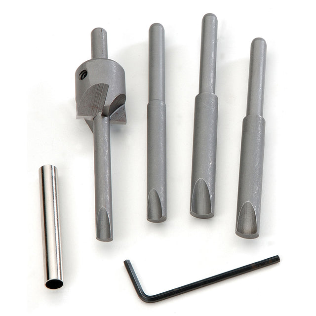 Cet ensemble d'alésoirs permet d'équarrir parfaitement les extrémités du bloc à crayon ayant une insertion de tube de laiton de 7 mm, 8 mm, 10 mm ou 3/8". Permets d'équarrir des blocs jusqu'à 3/4" de diamètre. Ensemble très complet, pratique lors de la fabrication de vos crayons!