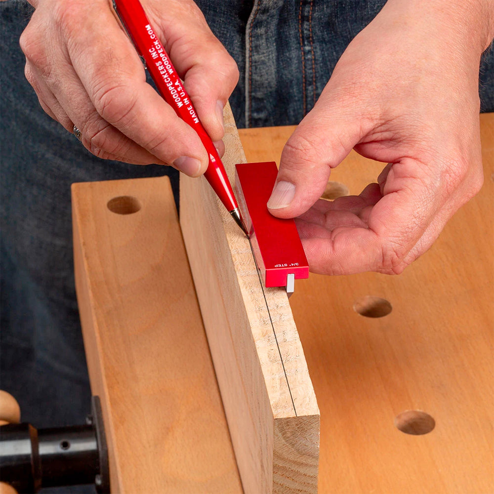 The most unique feature of the DelVe Squares is easy to overlook, but invaluable once you’ve found it. One side of the base is 1/4" from the blade and the other is 3/8". Mark from the 1/4" side on both edges of 3/4" stock and you’ve just laid out a perfectly centered mortise or tenon. Use the 3/8" side to locate center of 3/4" stock for joinery lay out or hardware installation. The 3/8" side also makes it simple to mark the face and edge of your stock at the same time at exactly the same point.