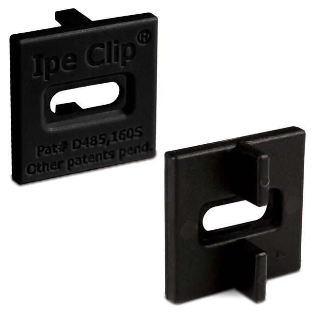 Invisible fastening system for decking. These hidden fasteners are installed the edges of boards and provide a 3/32" (2.38 mm) of gap spacing between boards. Ipe clip has a thinner leg which helps maintain a perfect gap spacing when materials are expanding and contracting due to varying climate conditions. Ipe clip fasteners are manufactured with a hardened stainless steel, black oxide coated insert inside a rigid chemical-resistant polypropylene shell. Ideal for installation with high density wood like ipe.  Perfect for use with exotic hardwoods and composite decking. Quick installation with a router or biscuit jointer.