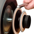 This wheel has exchangeable leather discs so you can easily replace a disc with a worn tip. Discs with alternative, narrower profiles are available as optional extra.