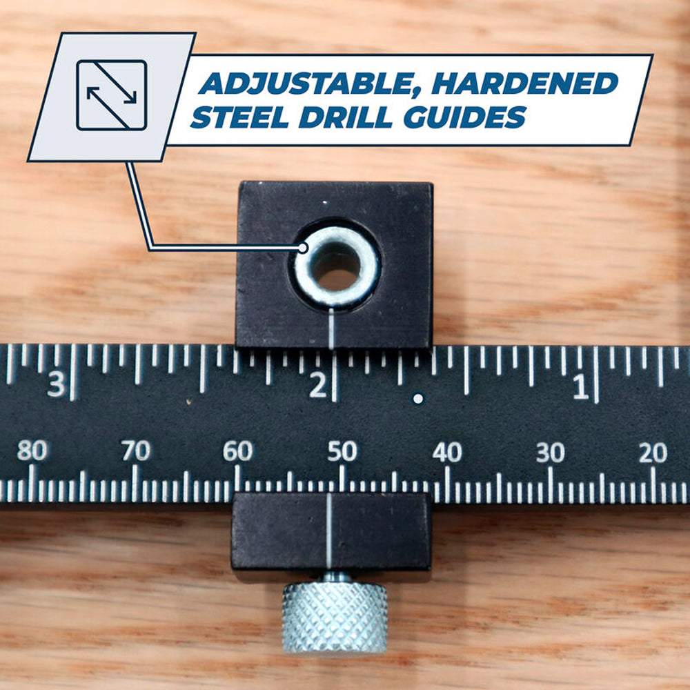 - Repeatable stops eliminate the need for measuring or marking each door or drawer