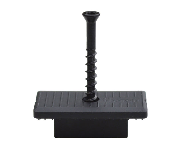 - Black HDPE fastener with pre-inserted screw practically disappears between deck boards.